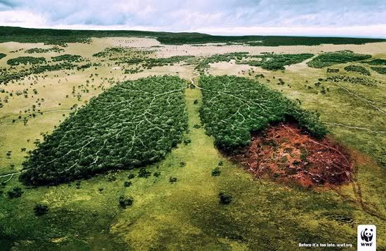 A imagem acima, o pulmão doente da floresta é uma alegoria de impacto do WWF — Fundo Mundial para a Natureza, campanha contra a derrubada das matas.